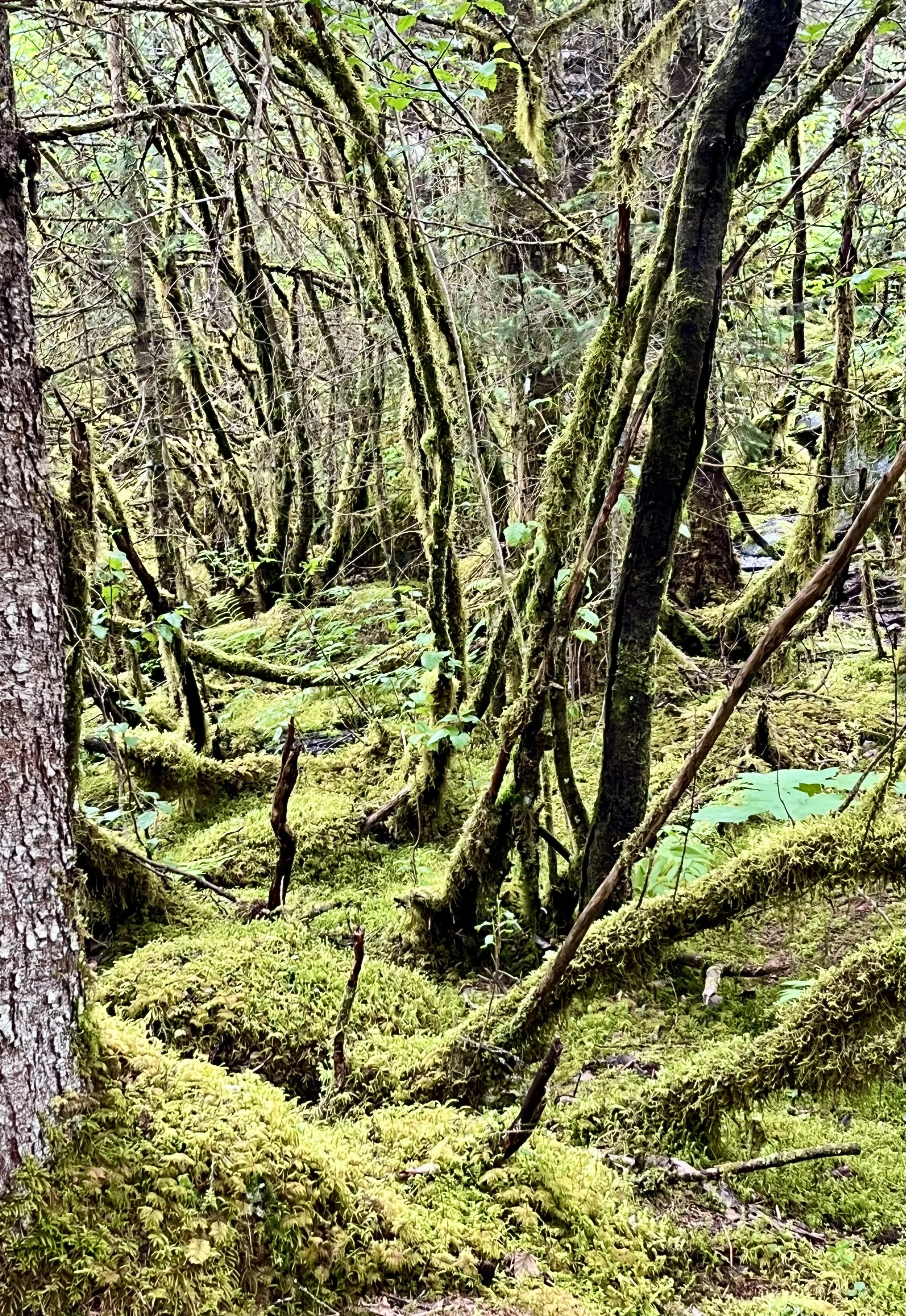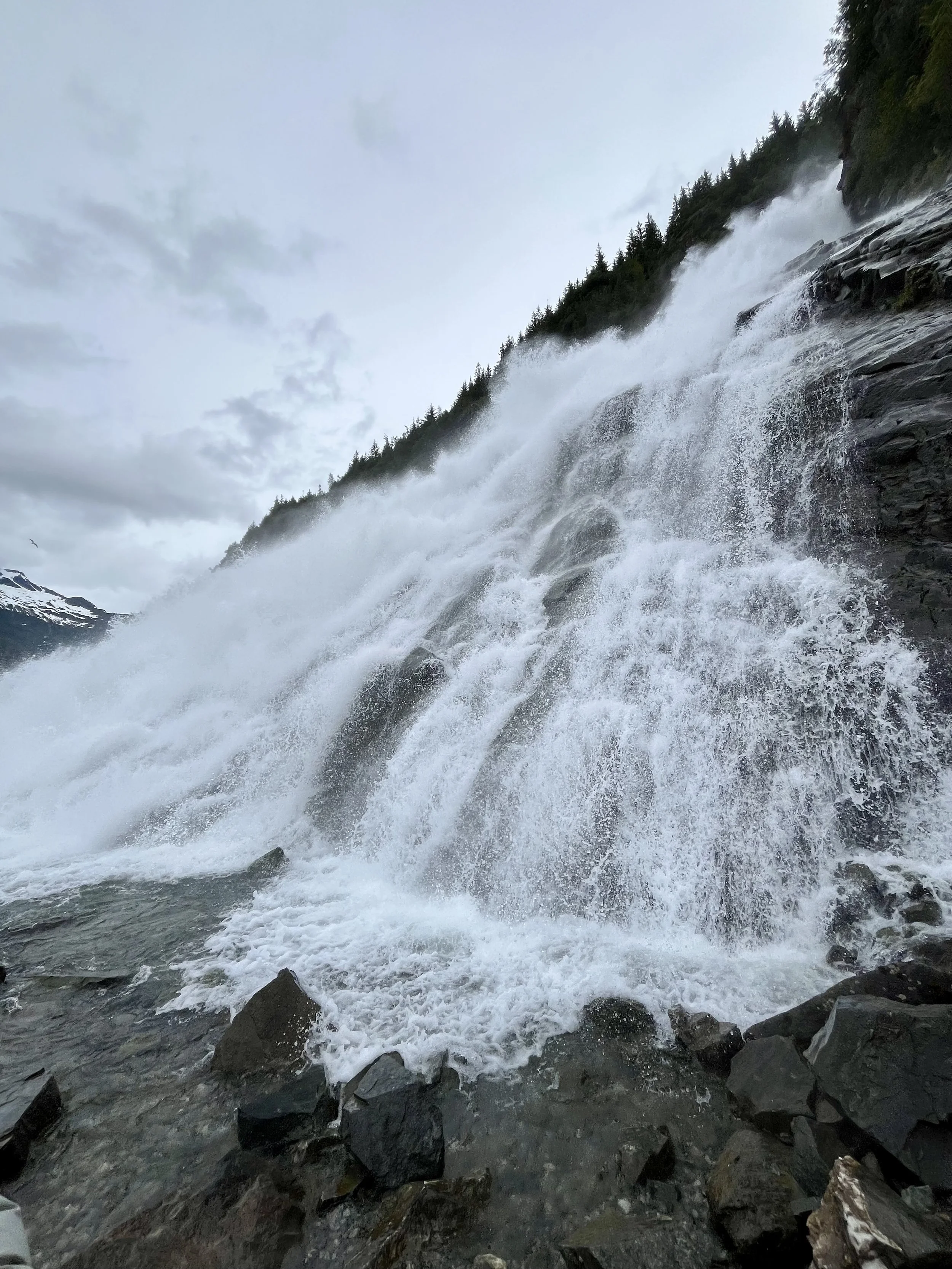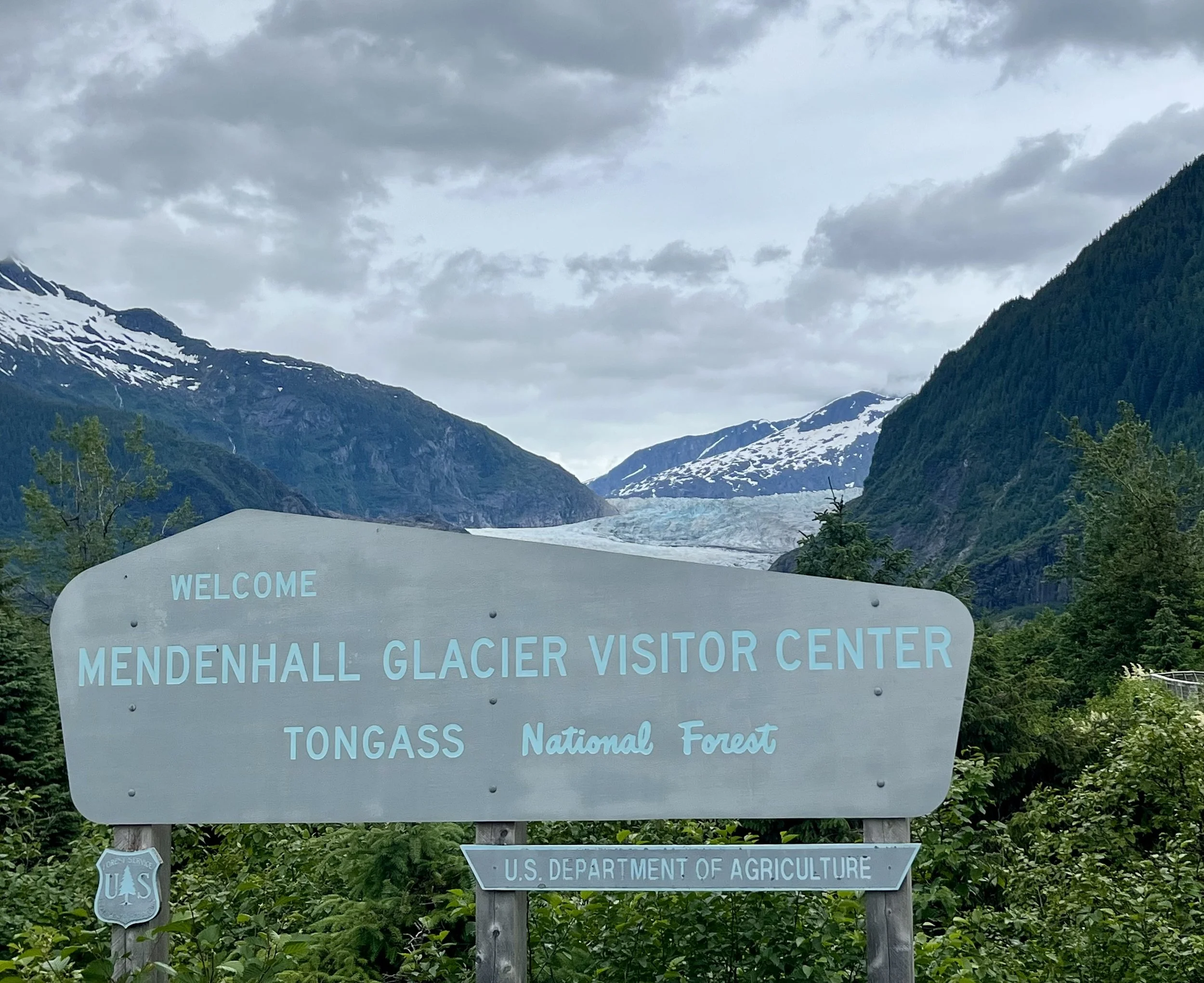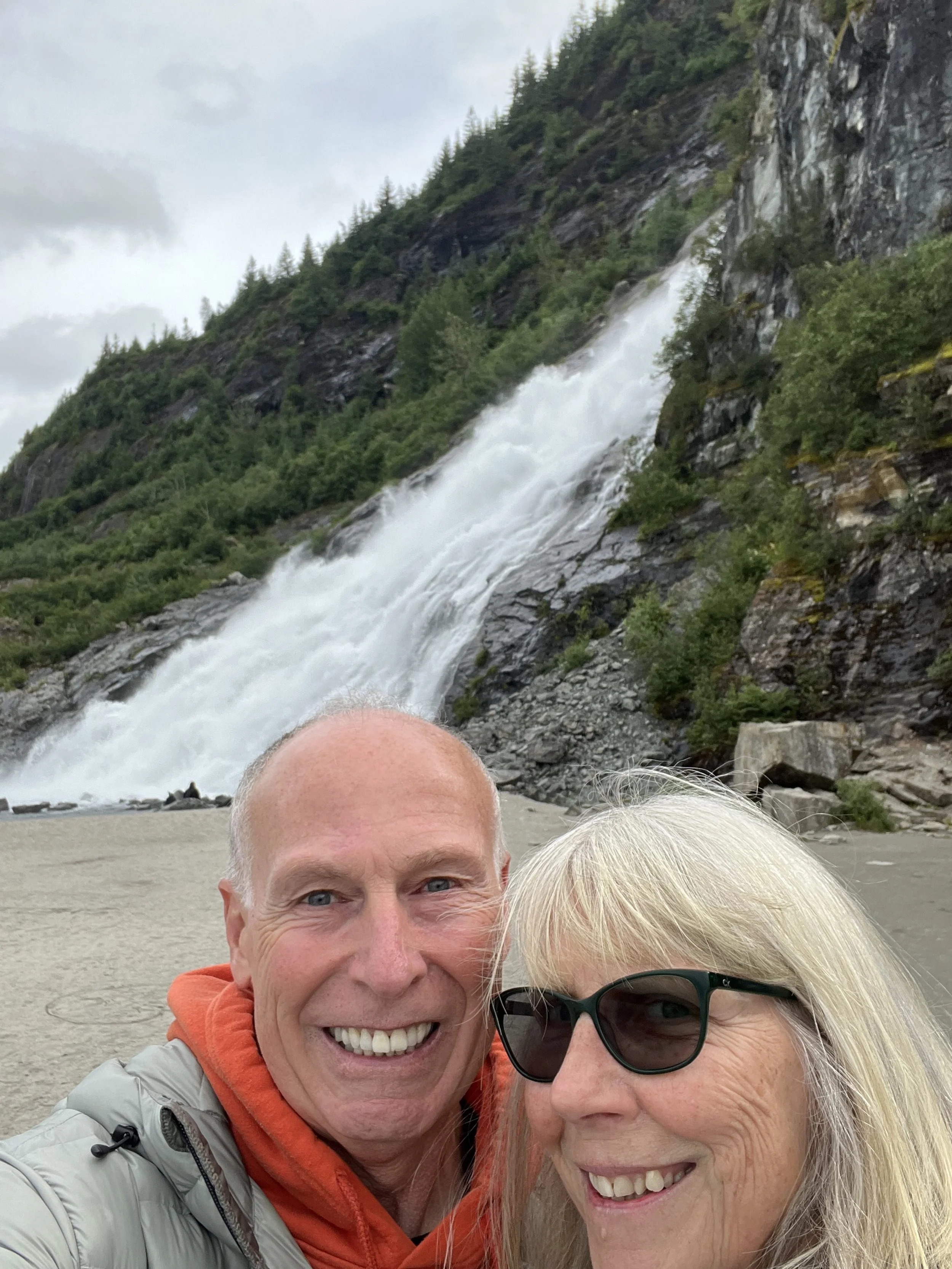 We cruised into Juneau this morning. The temperature was 47 degrees with a feels like a bit cooler and a 10mph ESE wind. It was another cloudy day with off and on rain. We had a “triple” shore excursion today that started with a visit to Mendenhall Glacier within the Tongass National Forest, whale watching, and a delicious lunch at the Orca Point Lodge on Colt Island. Not only did we see spectacular views of Mendenhall Glacier, we were able to hike to Nugget Falls and experience them only steps away. If it weren’t so cold, the spray would have been refreshing. Mendenhall is considered a mountain glacier and is about 13.6 miles long. The tour company allotted 65 minutes at this stop. Alan and I wanted to do two hikes that totaled 2.3 miles total. The visitor information advised it would take 1 hr 35 minutes to walk both trails and have time for viewing. We walked fast and were rewarded with stunning views. After visiting the glacier, we moved to the oceanfront and boarded a boat for whale watching. I probably took over 150 pictures and still couldn’t capture the magic of seeing a whale (or two together), blow/exhale, slightly surface and then dive with its tail the last to enter the water. Several of our sightings included two whales together - almost certainly a mother and calf. We also witnessed a bald eagle soar by. After about two hours of whale watching, we motored by boat for lunch at the Orca Point Lodge. The food was delicious; the salmon chowder was the best of the trip so far and the butternut squash was as creamy as, and tasted like, pumpkin pie! Add a small salmon filet, a sample of local steak, sourdough bread baked locally, more sides and it was a feast! Alan and I also sampled four beers from Forbidden Peak Brewery.