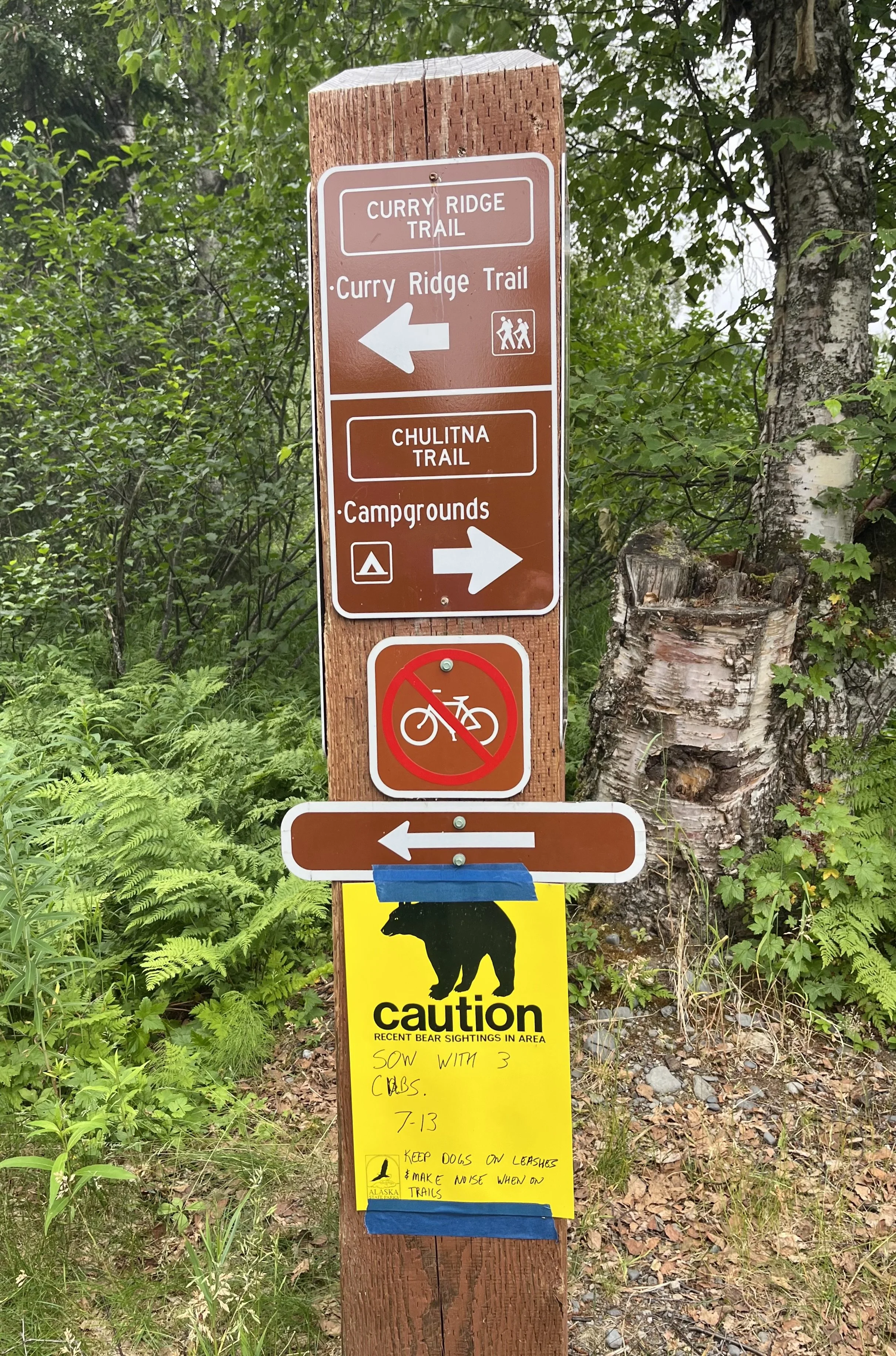 This taped sign warned of a bear sow with three cubs spotted in the area the day before; we didn’t see the bears.