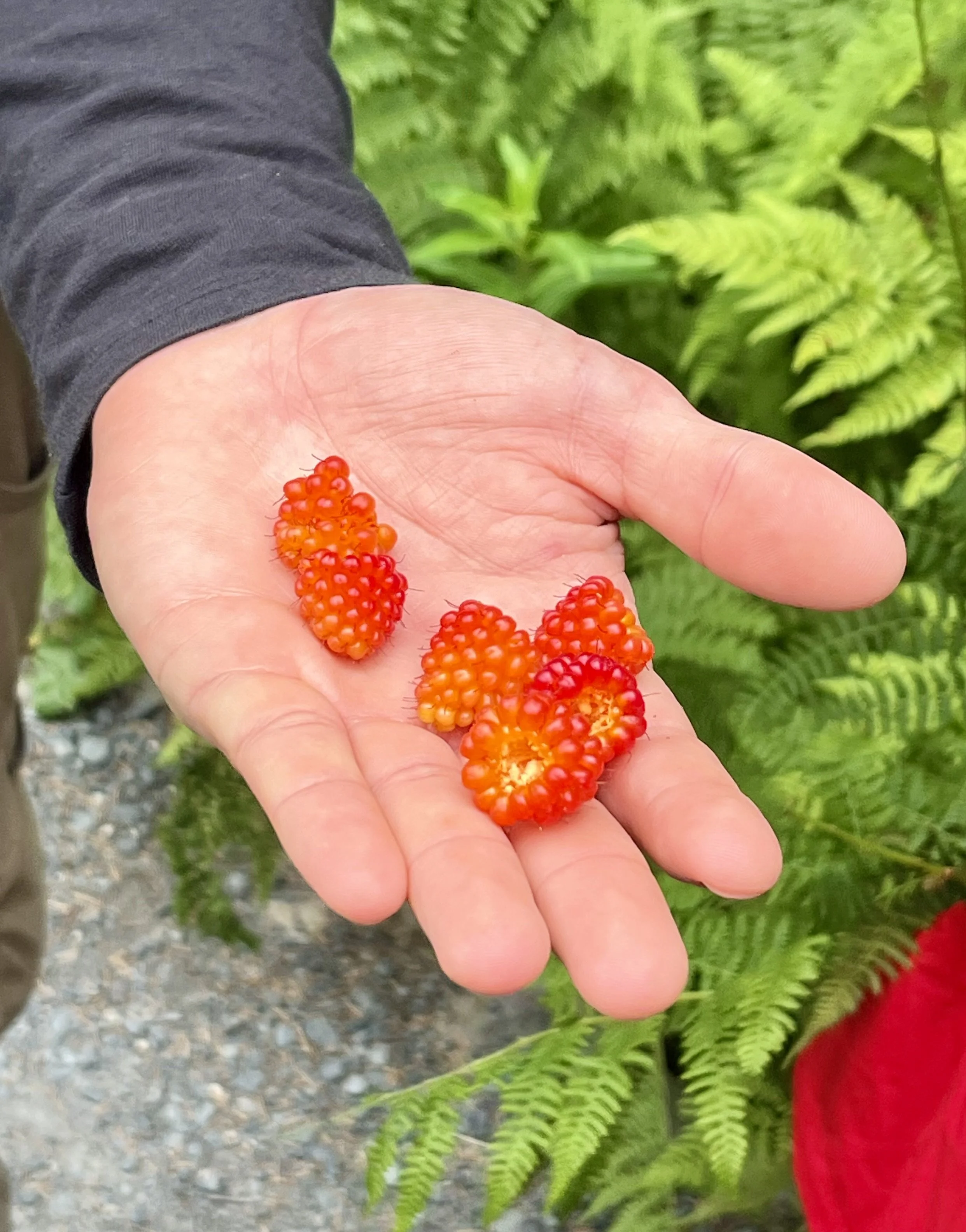 Our guide found a small patch of salmon berries and we each tried one.These were slightly under ripe and therefore a little bitter.