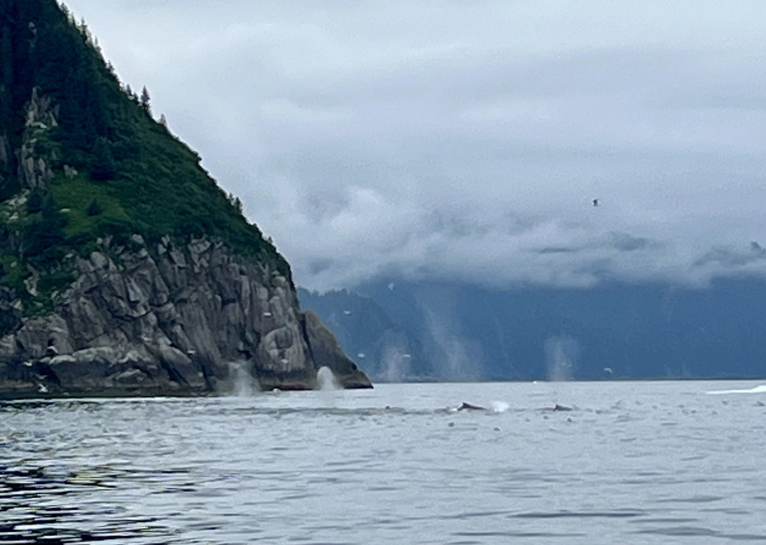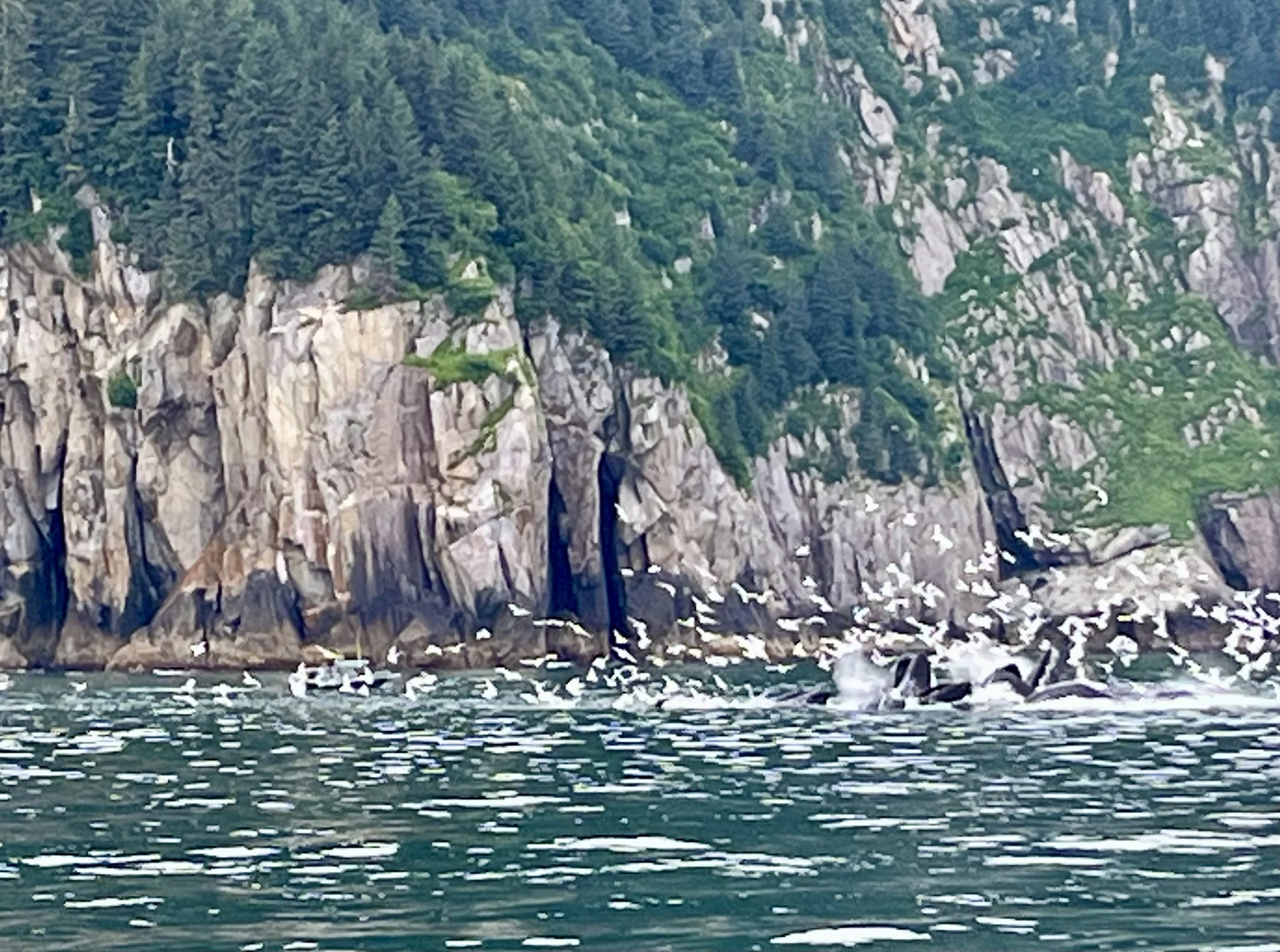 The humpbacks are on the right side of the photo and are bubble-net feeding. That is when a group of whales swim in a circle, blowing bubbles from their blowholes to create a "net" that encircles a school of fish or krill. The bubbles trap the prey, pushing them upward toward the surface, where the whales then lunge through the bubble net with their mouths open to feed. It was a unique display to witness; the gulls circled