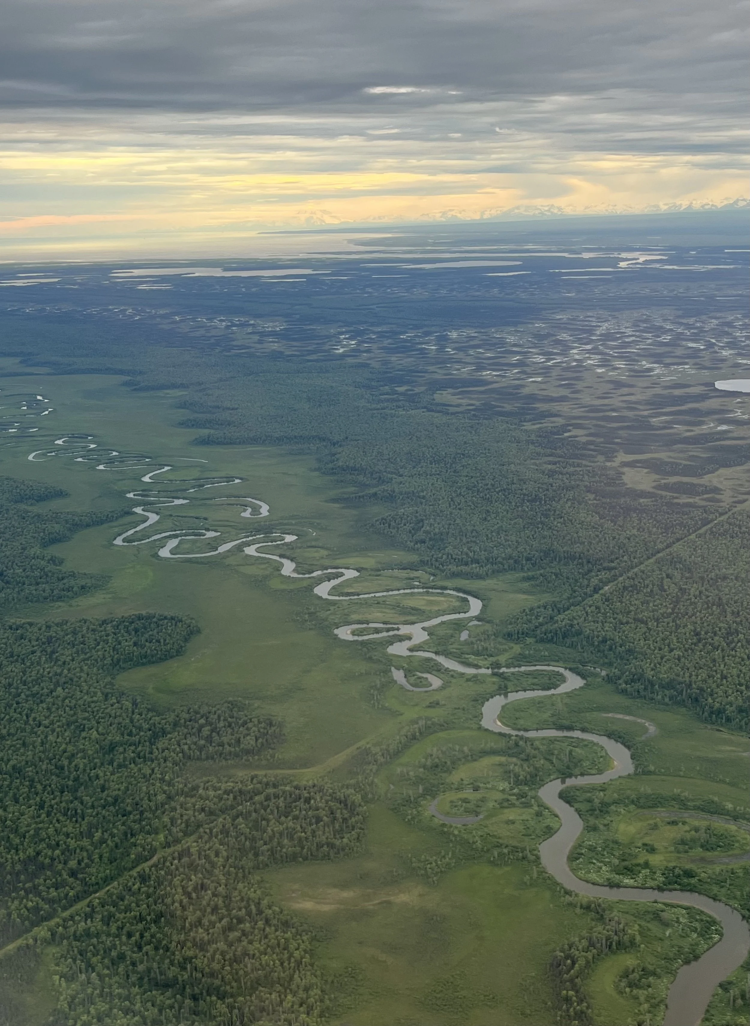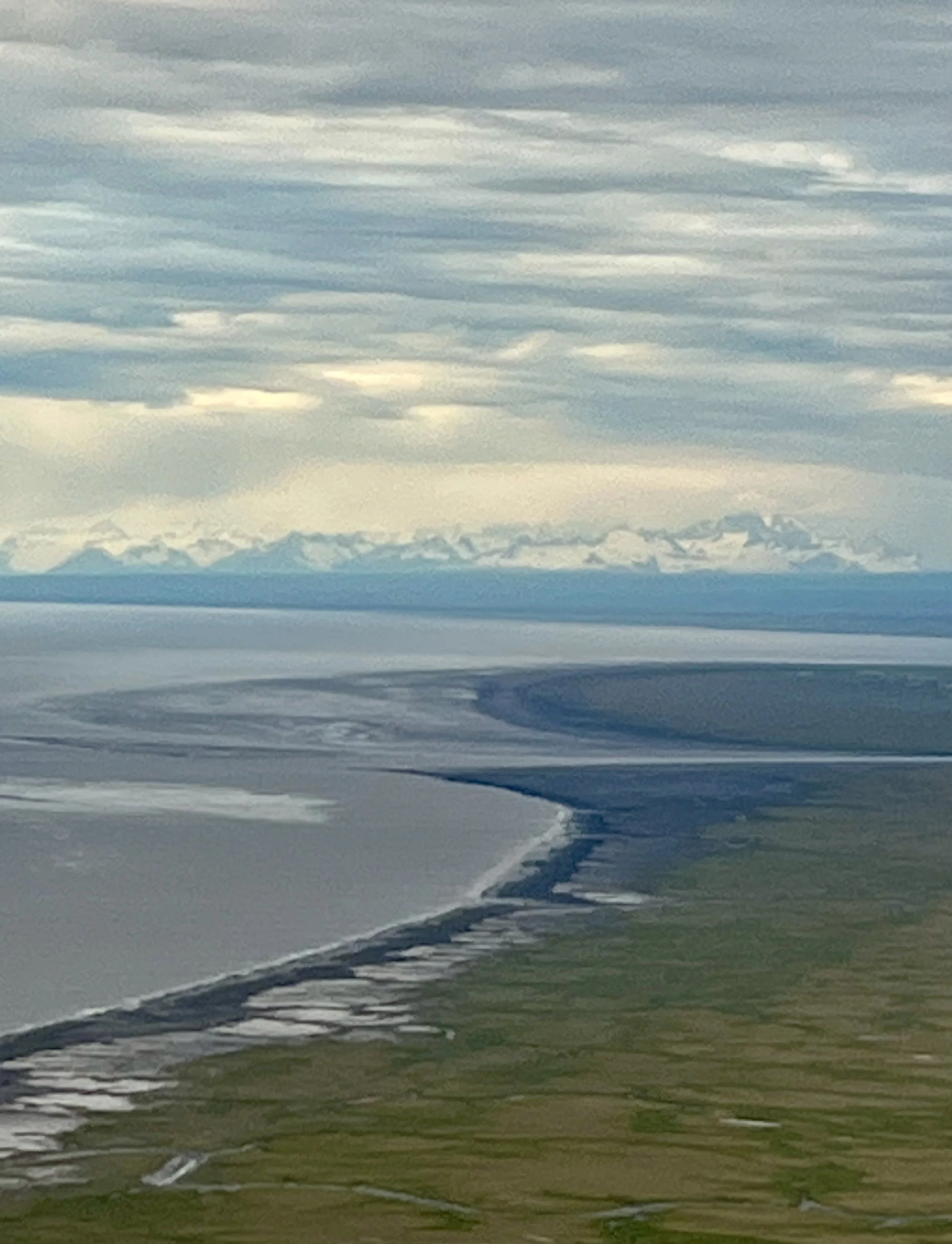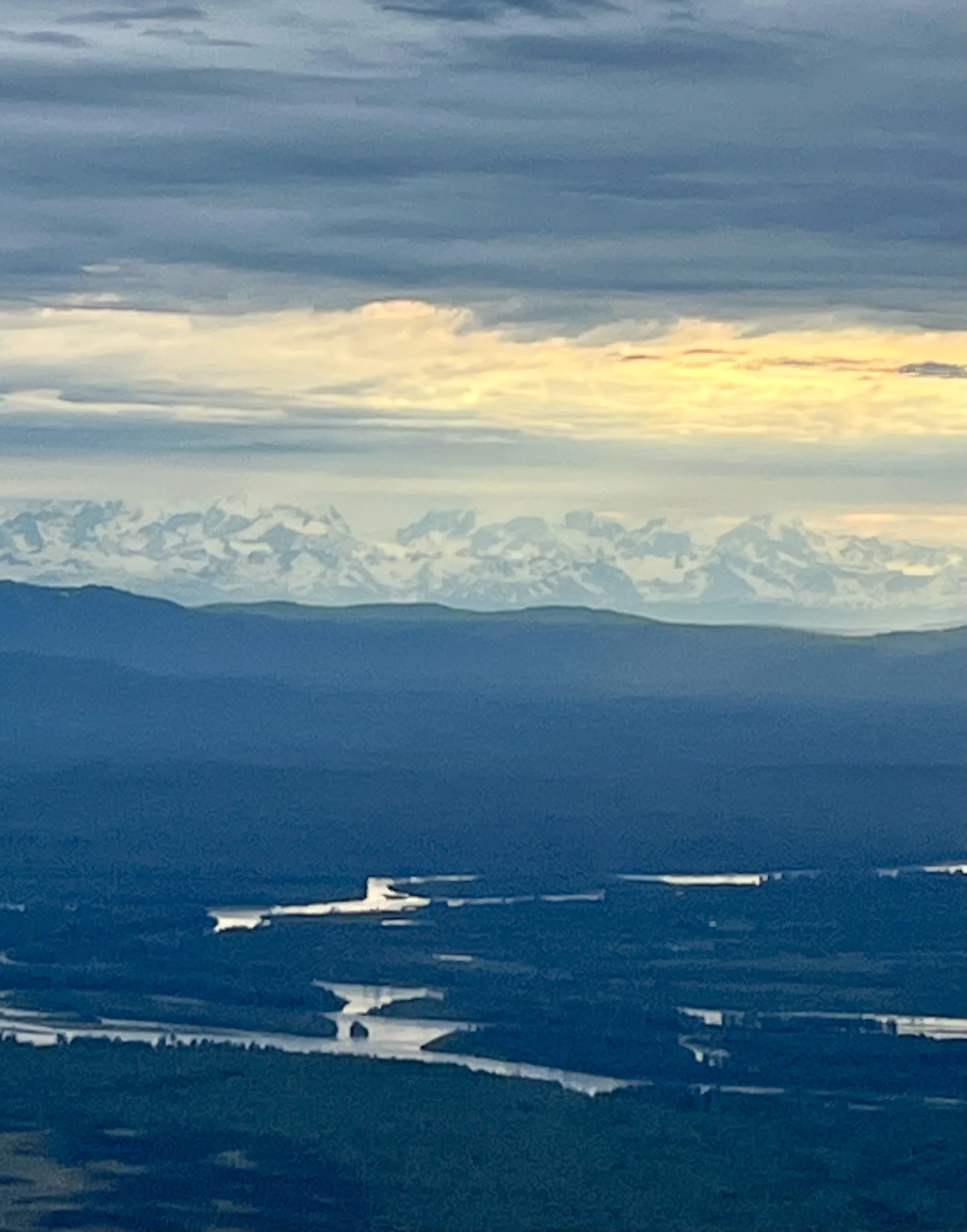 Alan and I started the trip, leaving home on July 5th at 9:00am, for Alaska. Just one, several hour, layover in Minneapolis and then arrived in Anchorage around 9pm (or 1:00am back home). There was still plenty of daylight at our arrival time. I managed to look out my window at just the right time and captured some mountain tops before the clouds took over.