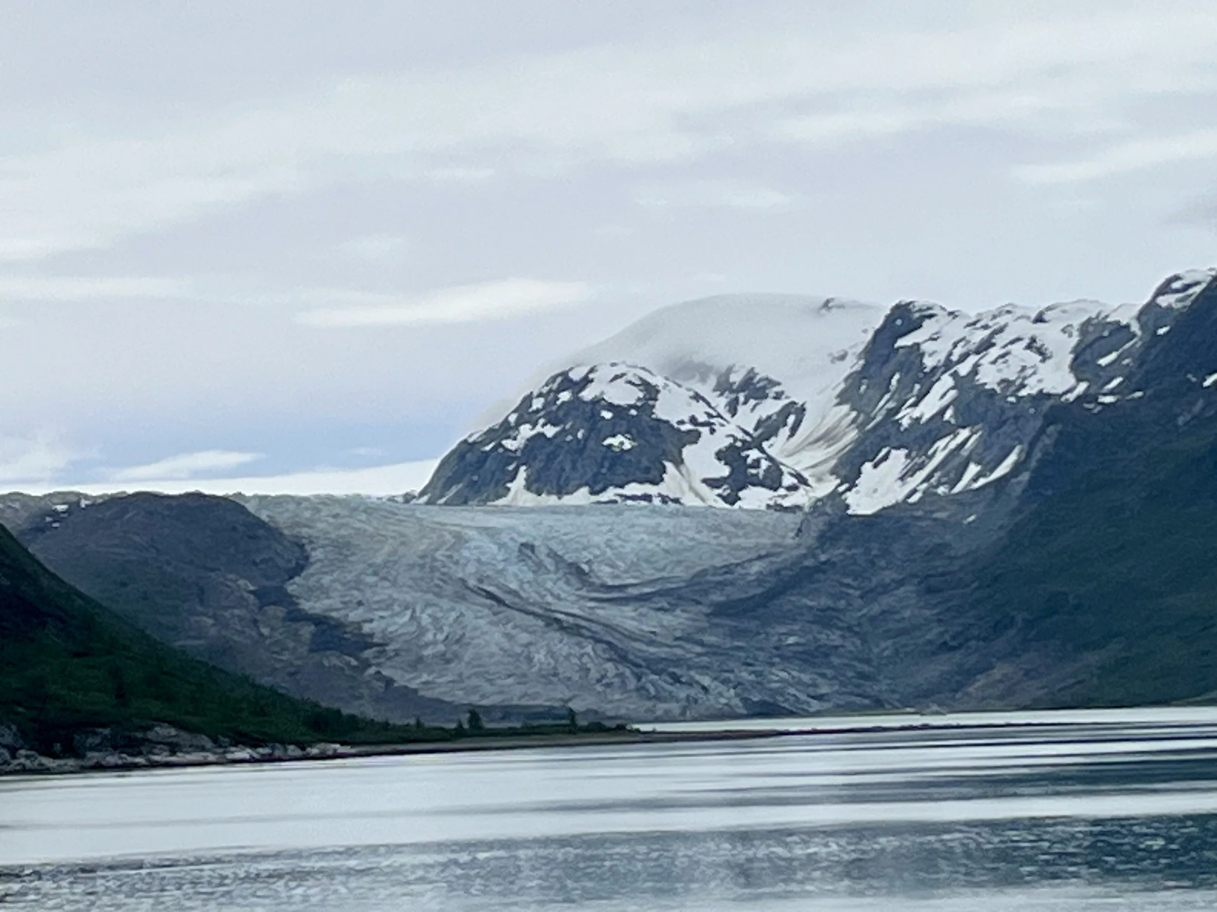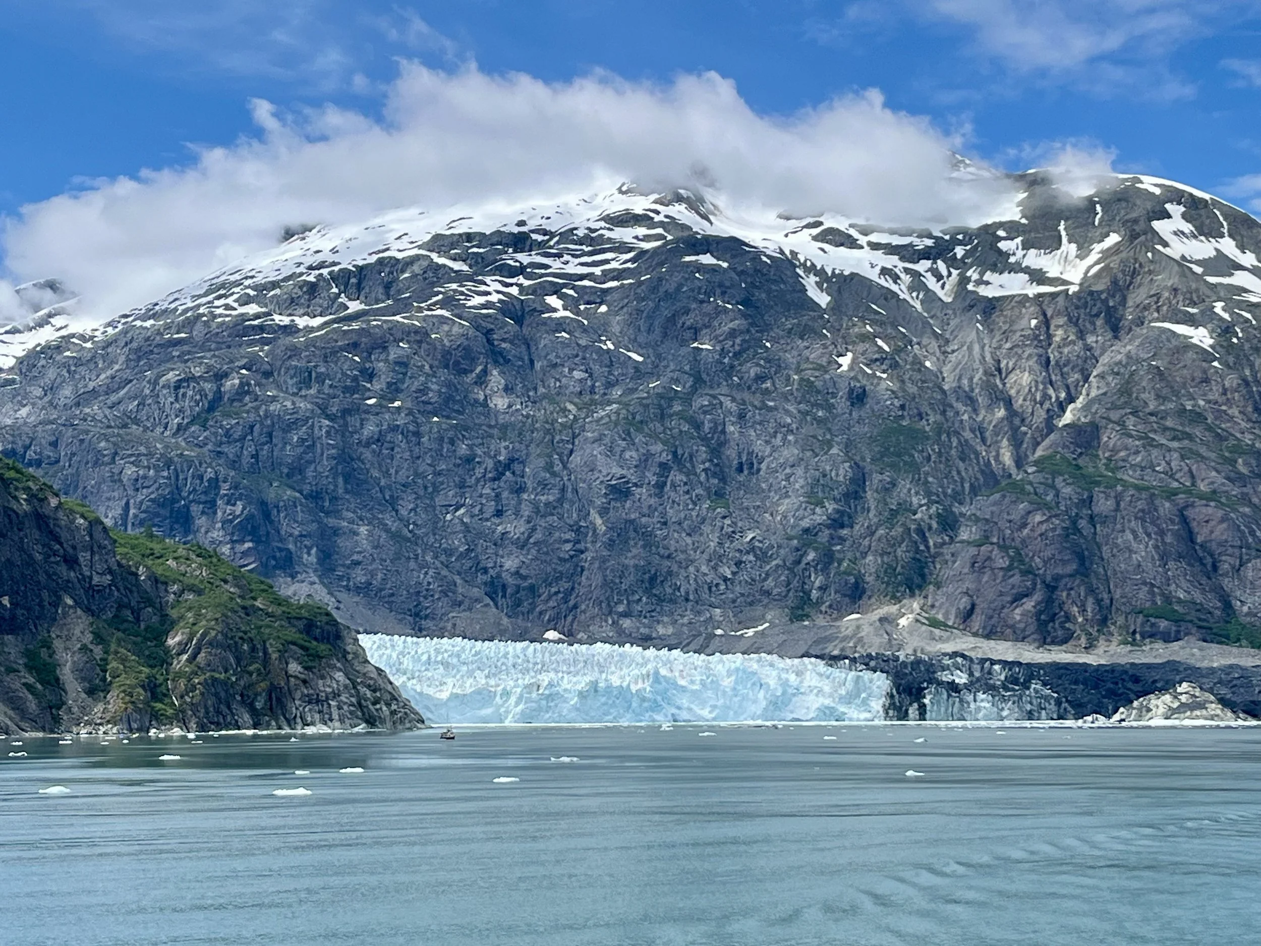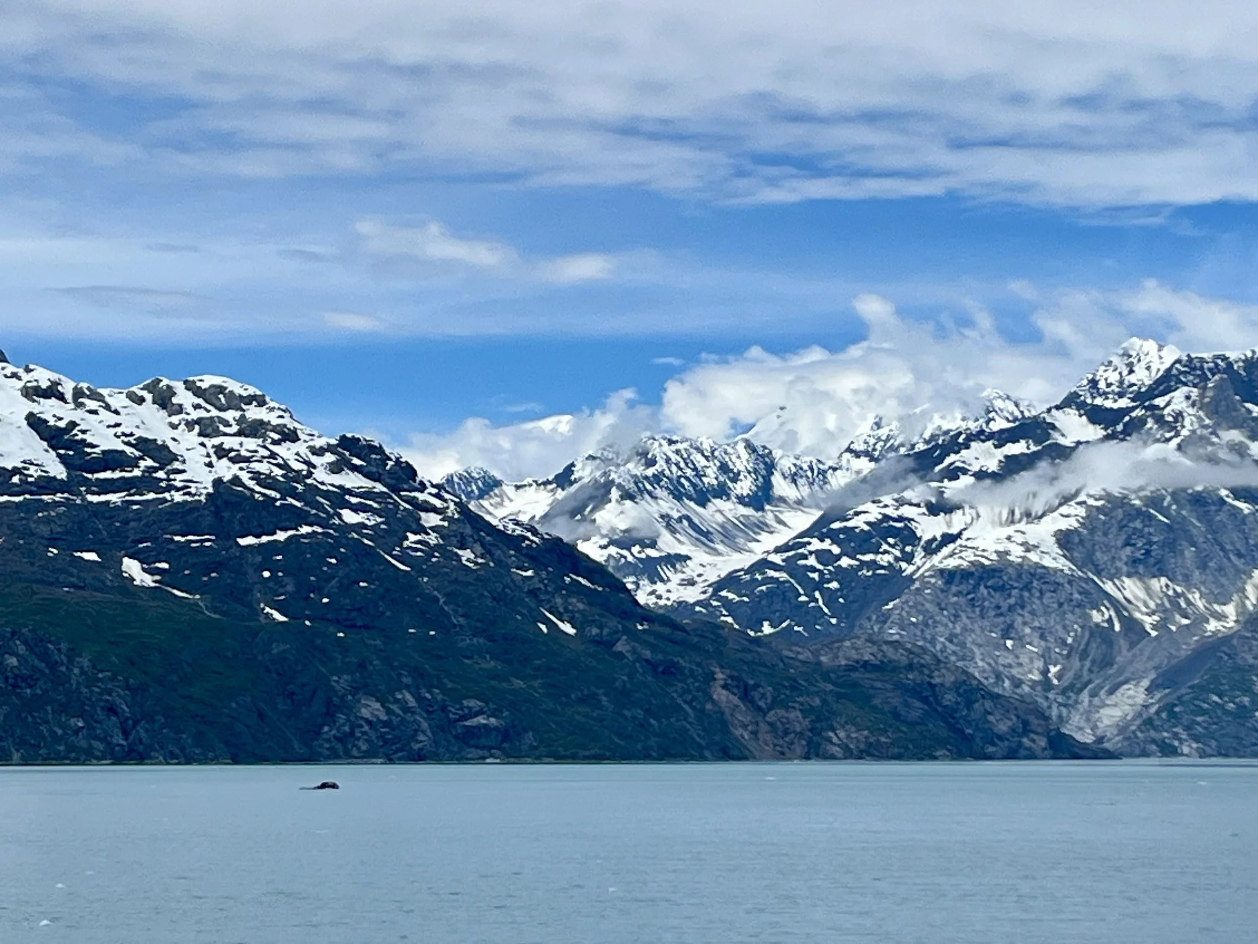 After leaving the Hubbard Glacier area yesterday, we cruised to Glacier Bay National Park. Today was another day of “cruising only,” with no available shore excursions. The captain cruised 65 miles through the Park so that we could view numerous glaciers. During mid-day we had a “group” lunch with 24 guests that were all part of this West of The Moon travel agency outing. Besides the hosts Randy and Owen, we knew a few of the others and made new friends. While cruising the bay, an NPS ranger narrated, and if you had your National Park Passport, you could get your stamp for this national park. In the evening, Alan and I saw several whales spouting, but we didn’t see any breeches so we couldn’t snap any pictures.