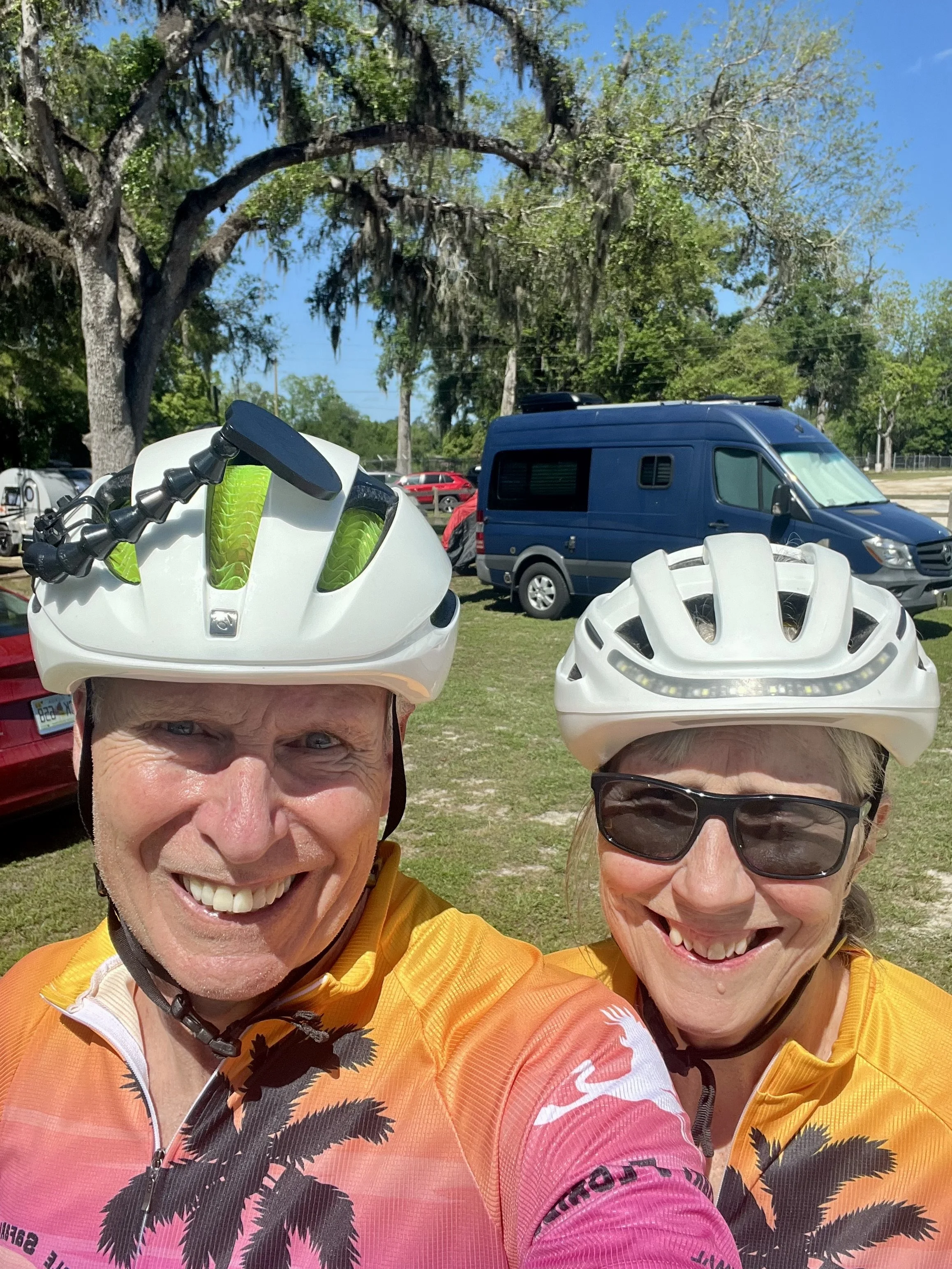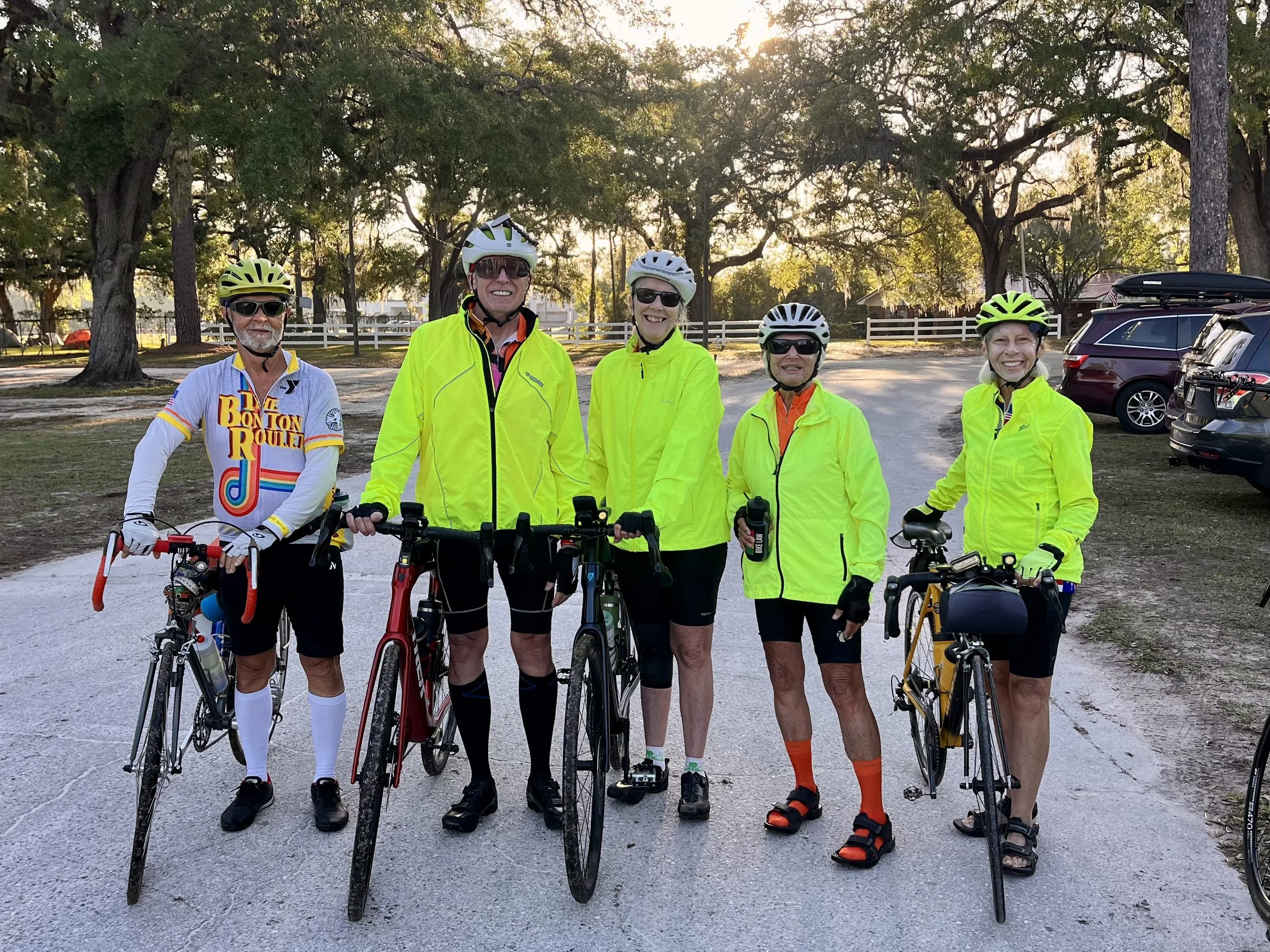 Five of our group preparing to ride on Day 1. From left: Fred, Alan, me, Sue and Linda.