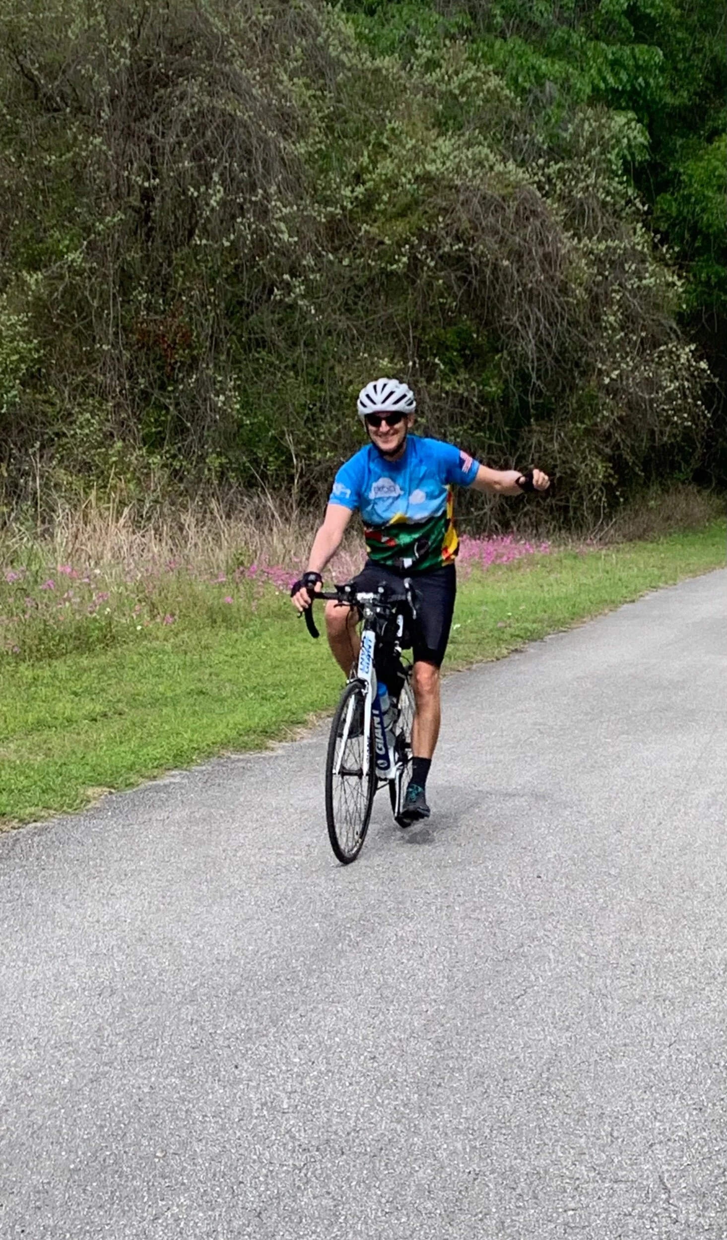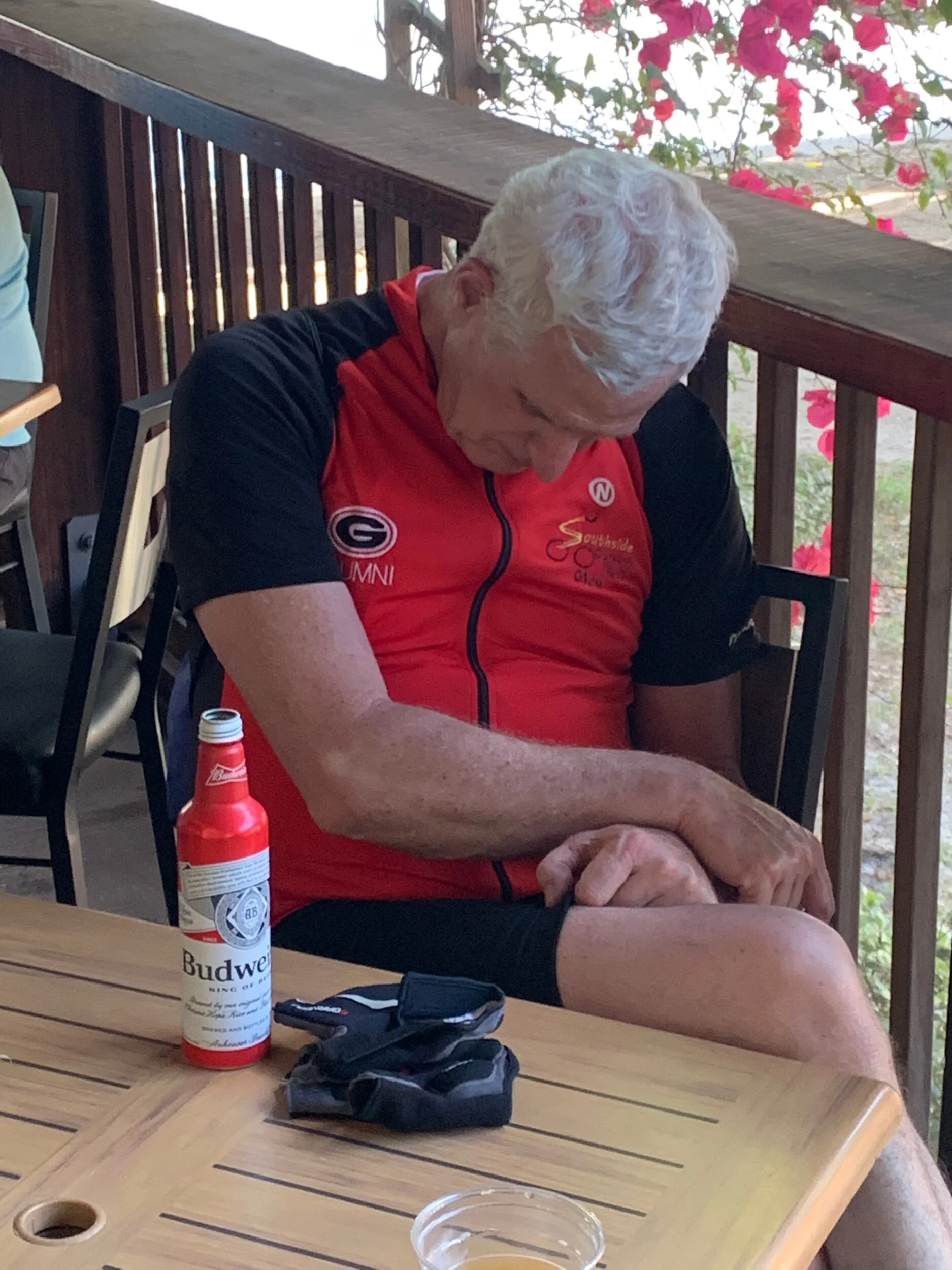 Sue, during one of our many stops the last 15 miles. It is kind of hard to express how hot, windy and hilly this last stretch was when we were all tired.