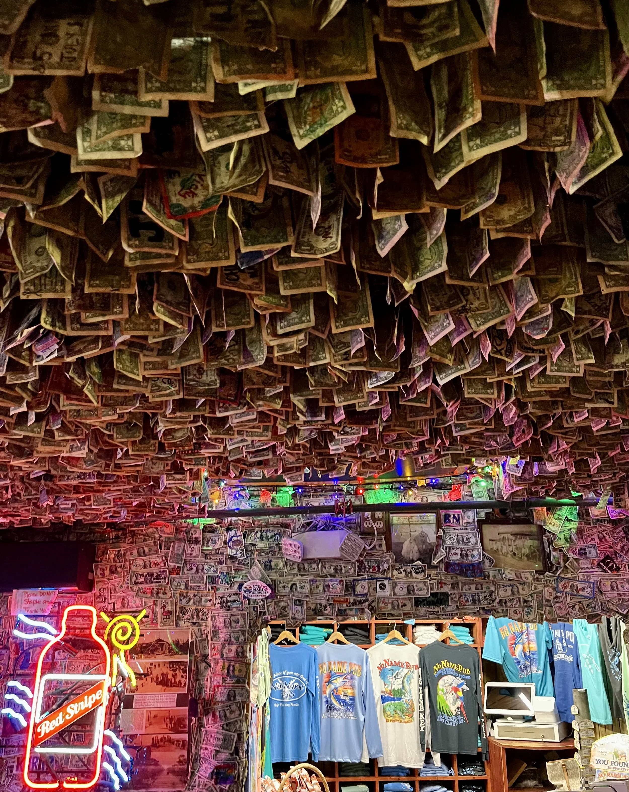 Inside the No Name Pub, the riders enjoyed a cool drink (water, soda or beer) and experienced the sight of dollar bills hanging everywhere.