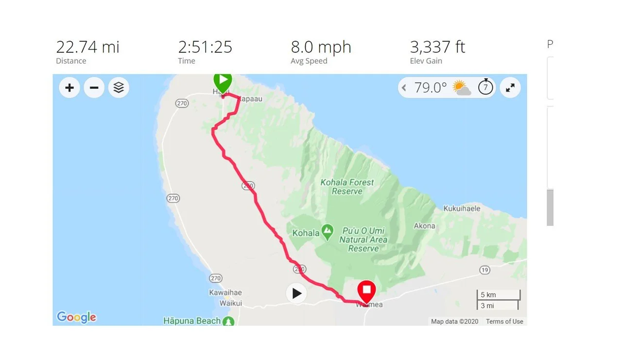 We cycled from Hawi to Waimea. We had some beautiful vistas today. Once again, no place to stop for lunch until we got to the end of the ride. We had about 6 miles of going downhill in which I used the brakes as much as I could and not blow out a tire (my rental did not have disc brakes).